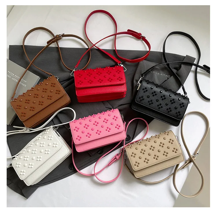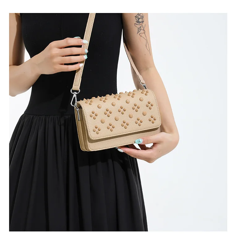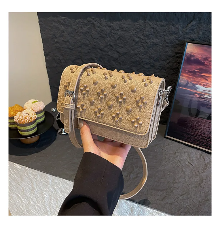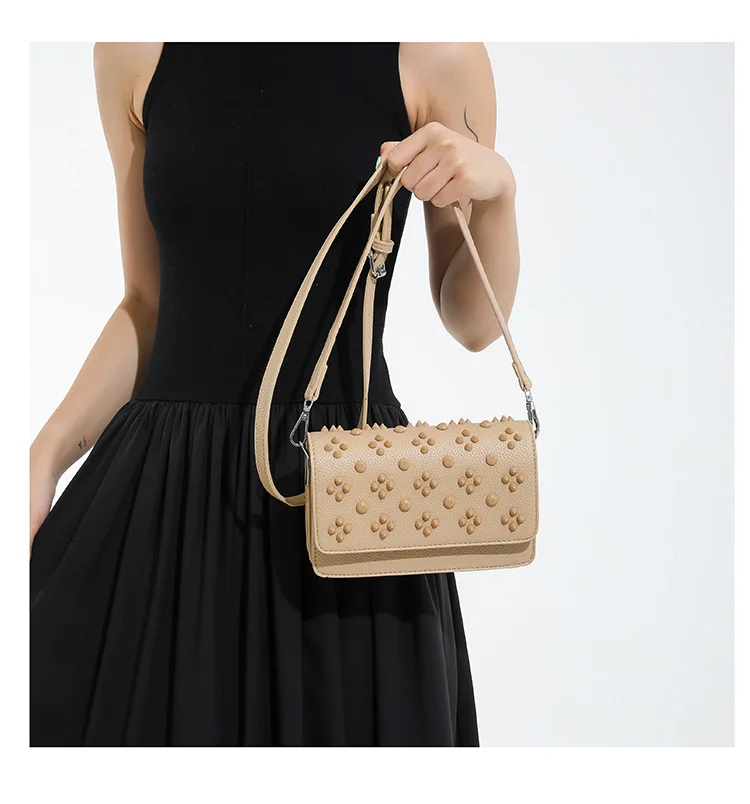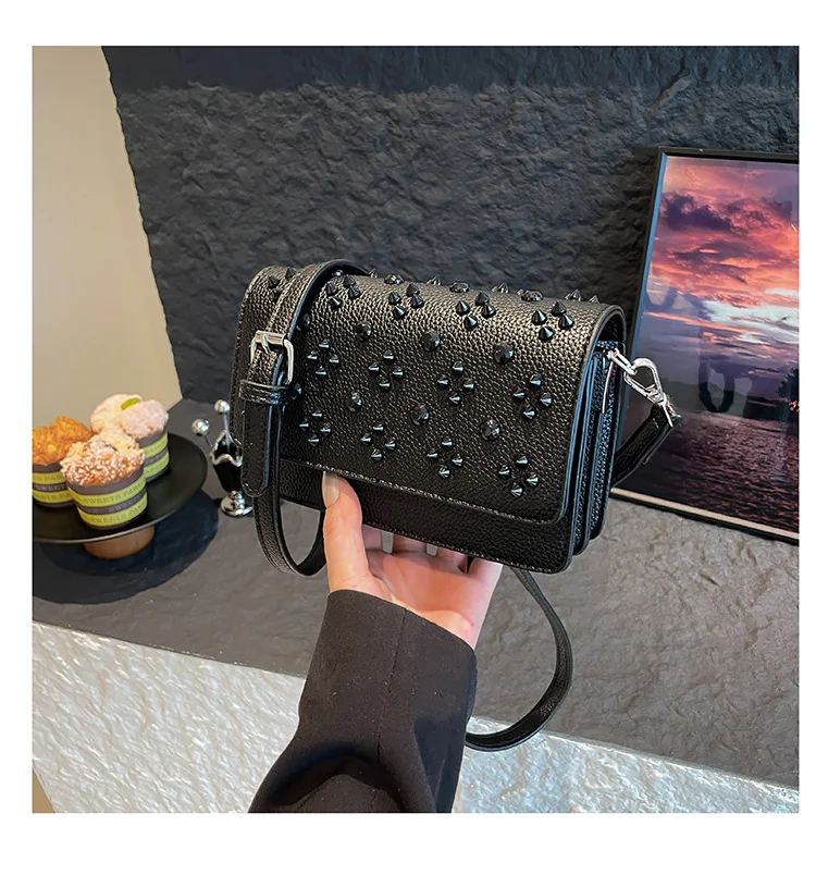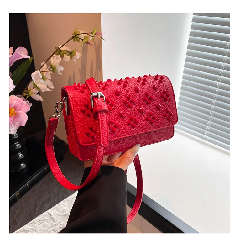 High-end small handbag with a textured lychee pattern and rivet details. Stylish, compact, and perfect for everyday wear or special outings.